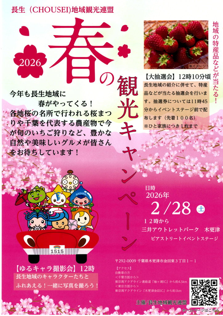 千葉県・長生(ちょうせい)地域では、豊かな自然と美味しいグルメが楽しめる春の観光シーズンを迎えます 。 各地の桜の名所で開催される「桜まつり」や、今が旬の「いちご狩り」など、魅力あふれる長生地域へぜひお越しください 。